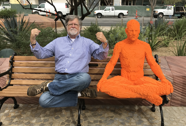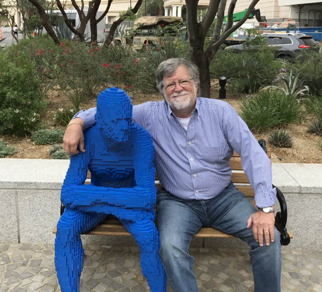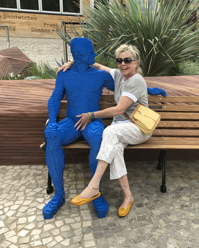 In the park next to the hotel New York are nine benches. Seated on each is a man made entirely of Legos. Really.