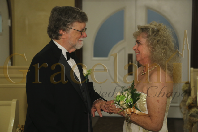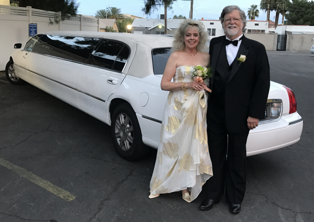 We reprised our lunch at Diablo's (we really like that place) and relaxed until time for our ceremony at 5:30p. At 5:00p, with us dressed to the nines, Roberto picked us up in the limousine (an extra-cost option in the package) and delivered us to the Graceland Chapel.