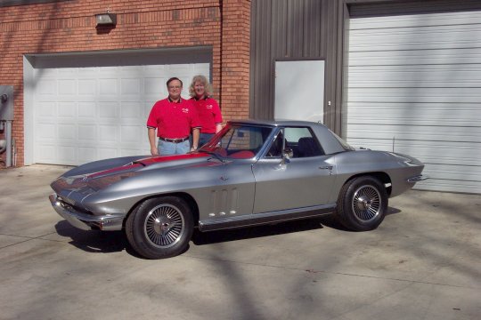 While stationed in New Jersey, driving in the countryside, Jim spotted the windshield frame of a mid-year standing above a stand of corn in a farmers field. It was serial number 15473, badly damaged in the left rear corner, drivetrain removed, and front-end removed to be placed on a NCRS show car. She had been left to perish and/or be reclaimed by the soil. Jim spent the next couple of weeks finding the owner and negotiating a purchase price for what was perceived by the owner as "trash in his field". She was recovered and brought home to Alabama, where over the last several years, she has had a complete "reclamation". I use the term reclamation, because as she sits today, there are the parts of at least 20 other Corvettes that have given their lives to give her "life". Built specifically as a driver, she has been meticulously restored not as she was, but as "we wanted her". As such, she is equipped with a new crate motor, dressed as a stock 350 Horsepower 327 cubic inch engine, with options that include: air conditioning, power steering, power brakes, telescopic steering column, headrest seats, shoulder harnesses, four-speed transmission, knock off wheels, and to bring her into the 21st century, cruise control. She is finished in Silver Pearl base coat clearcoat and sports a red interior and black softtop. The Hornaday's feel they have done their part, to "save" this classic Corvette that would have been lost to the world, and they are justifiably proud that this car has been chosen as the 1966 representative in the Historic Motorama.
