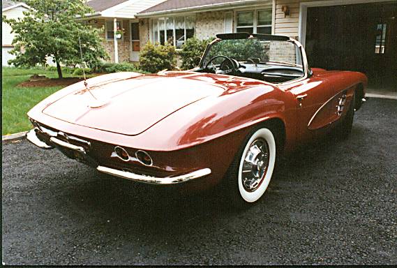 This 1961 Corvette is Honduras Maroon, Black interior with a white convertible top. It is equipped with a 270 hp-dual carb engine and a 4-speed transmission.