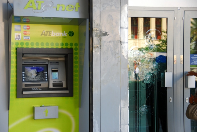 On the way back to the hotel, I spotted the front door of a bank riddled with bullet holes; no explanation: