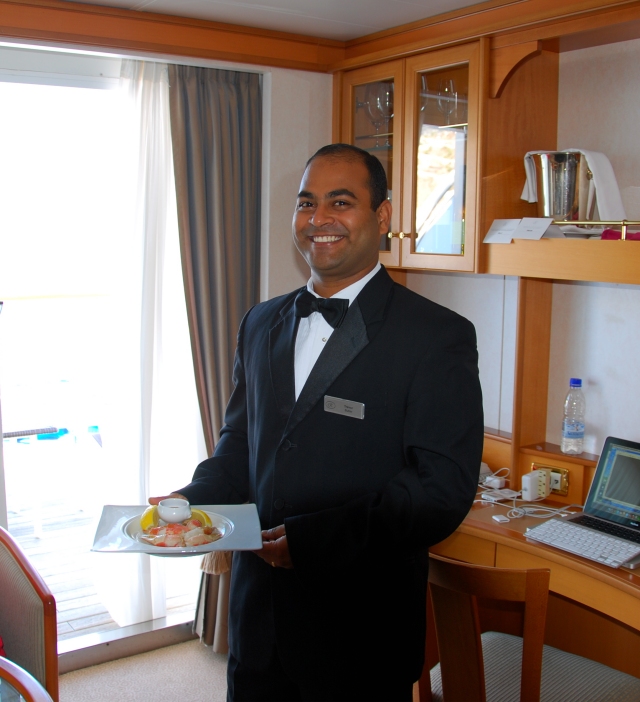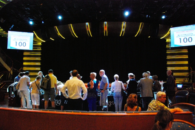 Champagne awaited (and graciously accepted) as we made our way to the theater to check in and get our room key and photos taken. Though we were on the first bus (so far as we could tell) 89 people had already checked in and our number was 131. Sorta like a "Now serving #xxx" in a butcher shop. SWMBO? Not pleased.