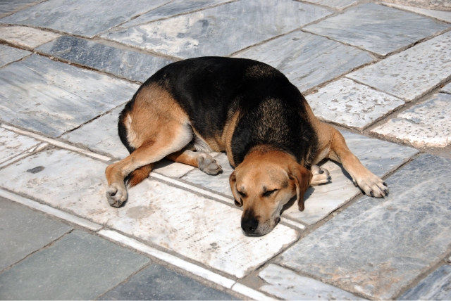 Back to the hotel at 12:45p. A side note: Everywhere we went in Athens, large dogs were sleeping on the sidewalks. Some with collars, some without. At no time did we ever see one of these dogs on their feet; they lie in about the same position as this one: