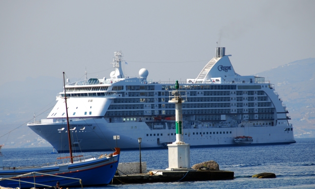 Up for mandatory lifevest/evacuation drill at 10:15a and then pool time (and food time) until we boarded the tender for transport to Mykonos. Curiously, this life-vest drill didn't include putting them on and marching to the lifeboat deck as we've done on previous cruises. Instead, they just had the crew show us how to put them on (kinda like on an airplane take-off demo) and we were out of there.