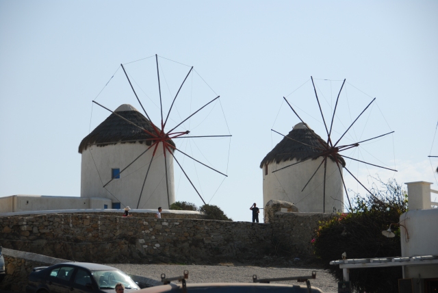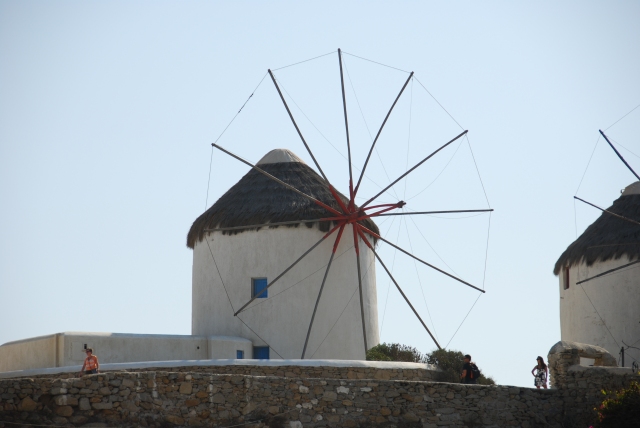 Above and below are examples of the famous windmills of Mykonos. They used to be used for grinding grain as gusty winds blow constantly here. None are in operation now (hence no fabric on the vanes).